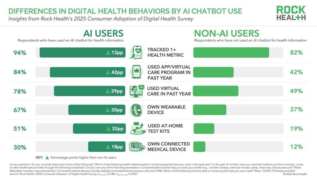 Over the past decade+, we’ve chronicled a rise in consumer adoption of digital health channels and tools: telehealth touchpoints during the pandemic normalized virtual care; wearables crossed into the mainstream; online search and health apps became regular channels for health information and management. AI chatbots are the latest chapter, introducing an always-on layer of personalized guidance that helps people make sense of (and act on) health information, whether they’re working through a new symptom or years of their own data. Consumers are already beginning to arrive at clinical encounters AI-informed, feeling a step ahead of a comparatively slow and steady system.