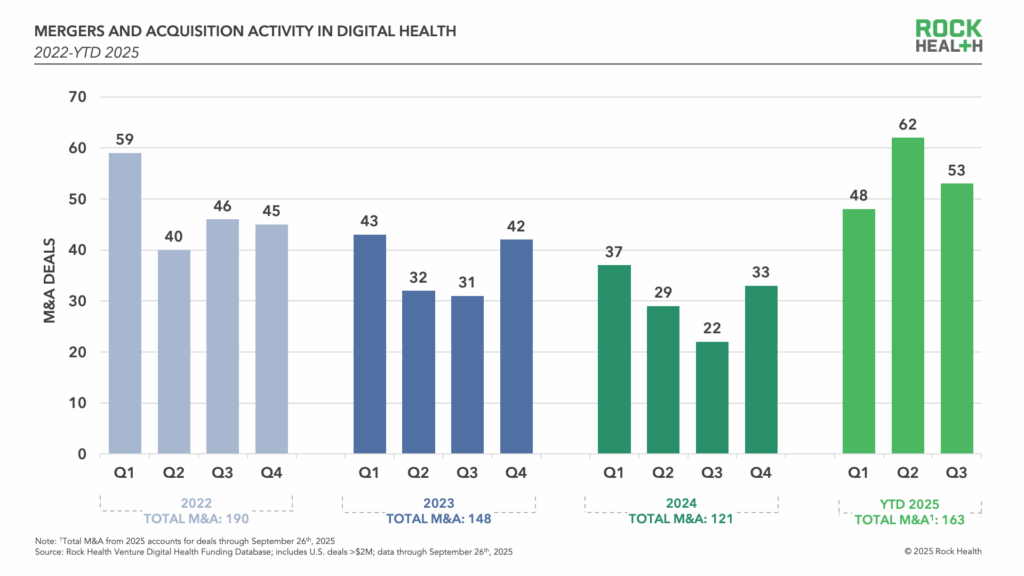 Autumn is here, Q4 is near, and our funding and M&A data nerds have no need to fear—we’re hard at work crunching numbers for our quarterly breakdown coming next week. An advance sneak peak: as Q3 wraps up, we’ve already tracked 163 acquisitions of U.S.-based digital health startups so far this year—up from 121 in all of 2024 and 148 in 2023, with a quarter still to go. Last week added to the tally: RevSpring scooped up Kyruus Health to combine patient engagement and payment technology with provider data, search, and scheduling solutions, and Glooko acquired Monarch Medical Technologies to expand its metabolic reach. Deals like these are driving M&A volume to new highs, and some companies are threading them together into tapestries—earlier this month Innovaccer added Story Health, its fourth acquisition in two years, as part of a push to layer on new capabilities.